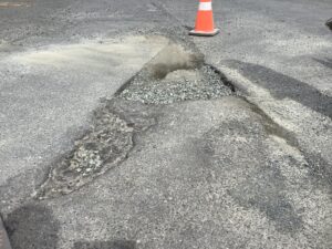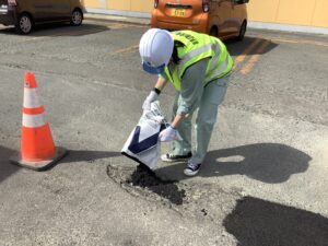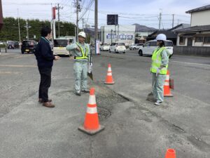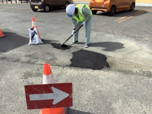 ジョイス見前店さんの駐車場の穴補修で、エースパッチ施工現場に行ってきました。